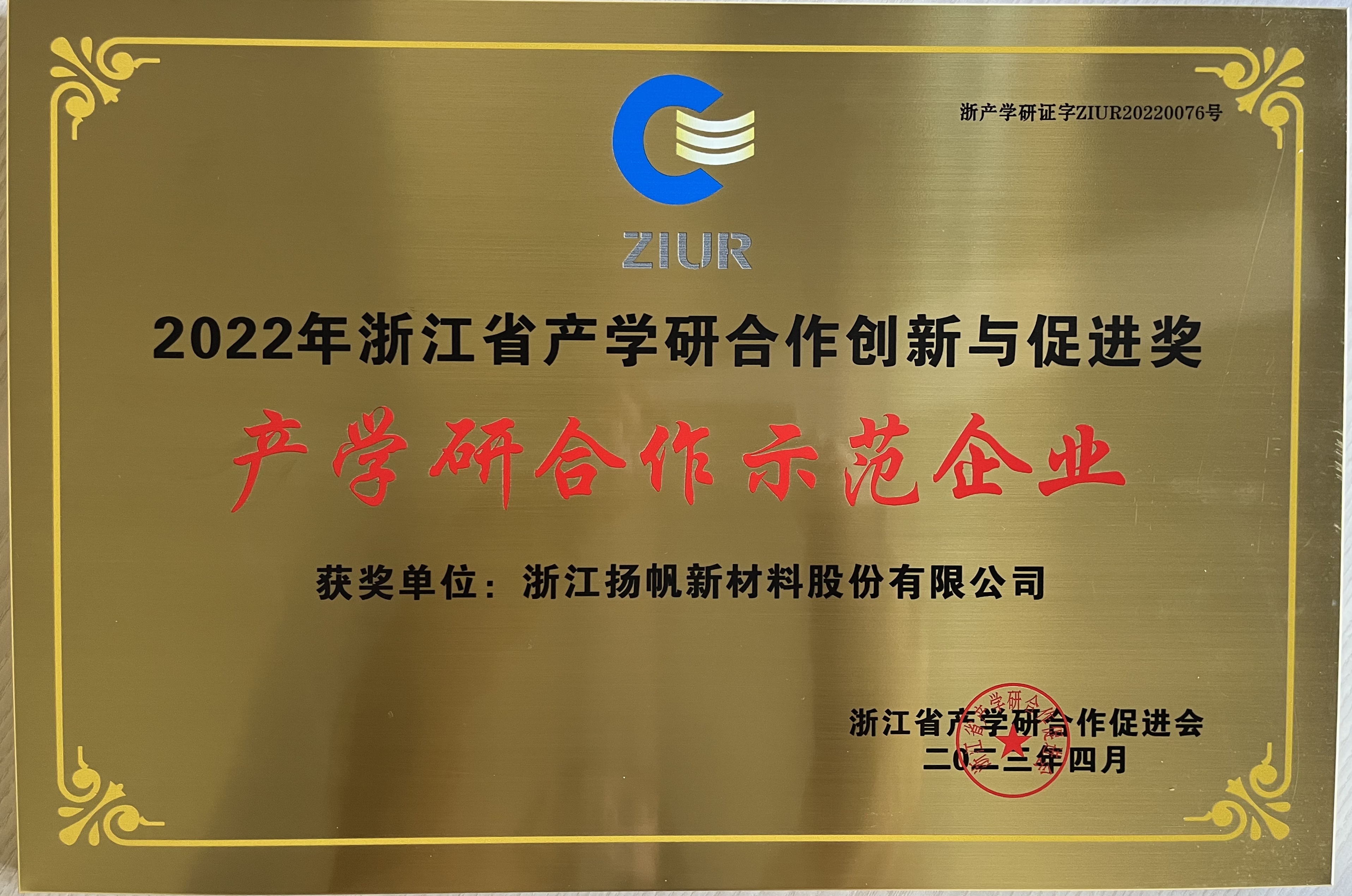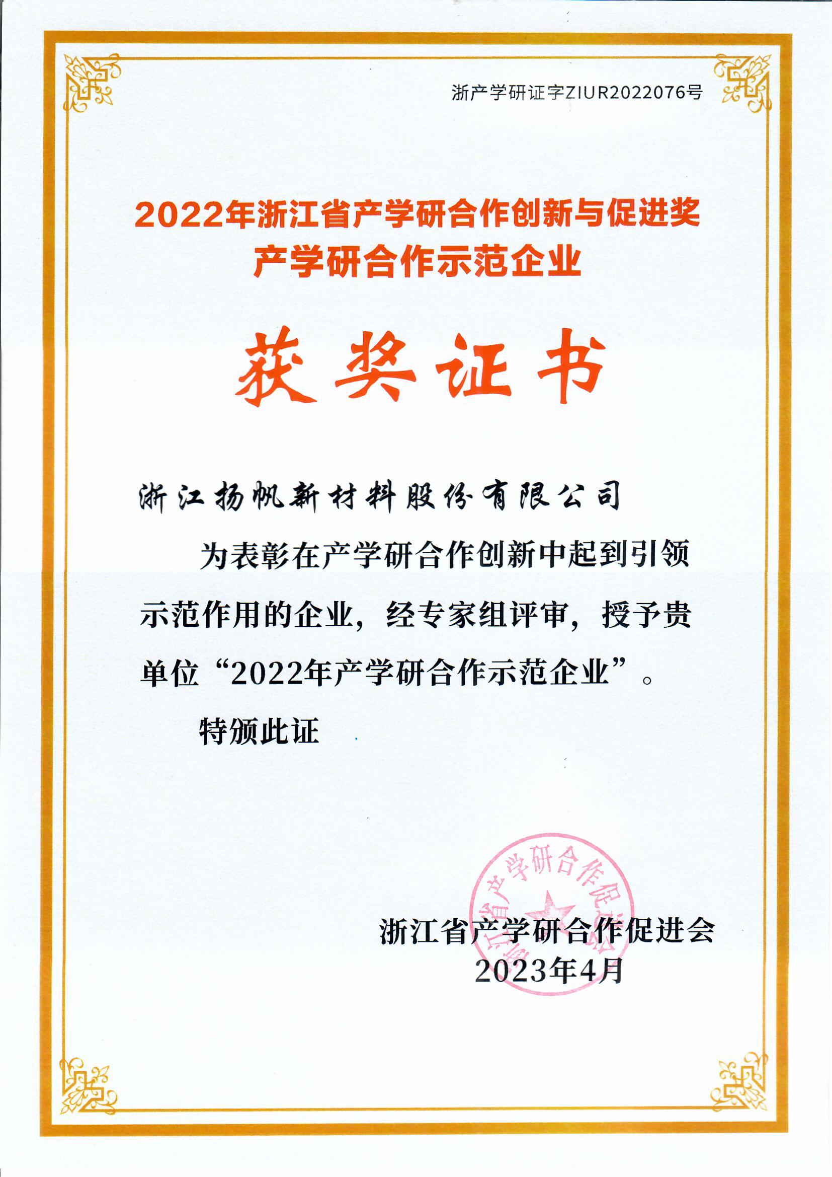 浙江杭州  416日』揚帆新材榮獲“2022年浙江省產學研合作創新與促進獎 產學研合作示范企業