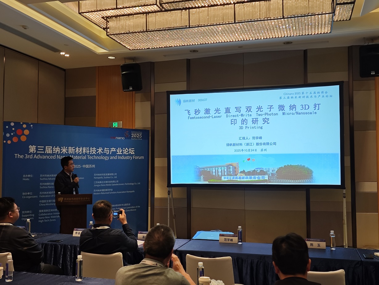會議期間,我司研發項目經理范學峰在納米新材料技術與產業論壇中,就《飛秒激光直寫雙光子微納3D打印的研究》做出了精彩的報告,詳細闡述了我司在雙光子微納3D打印領域的研究、進展與期望。
